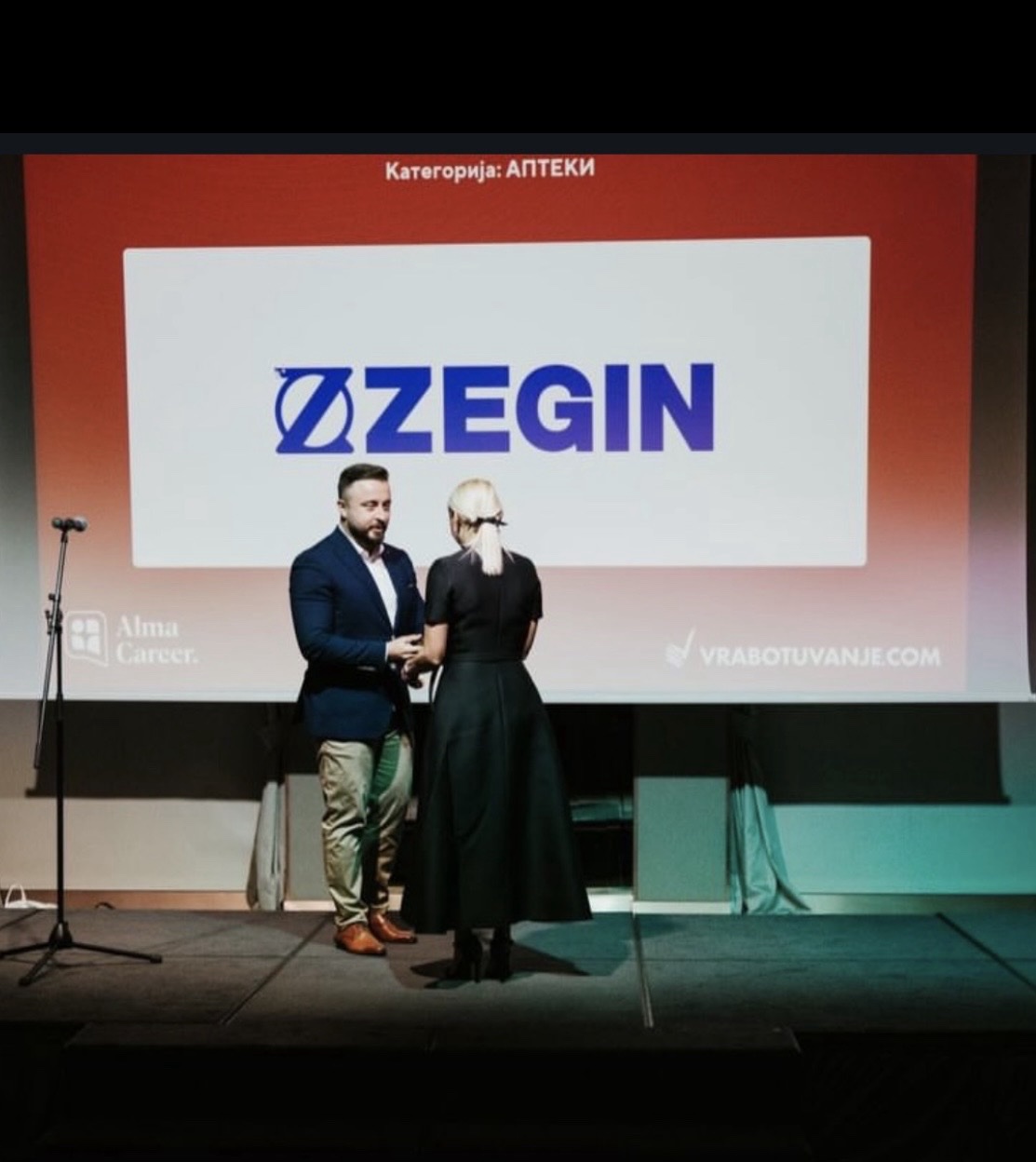 Kompanija Zegin u svom sastavu poseduje 230 apoteka, savremeno visoko regalno skladište lekova i polikliniku dr Verica Mehandjiski. Konsultacije sa obavljaju sa najboljim lekarima i specijalistima u Skoplju i Republiici Srbiji. Učestvuje na svim većim kongresima, seminarima i sajmovima - "Novine u farmaceutskoj praksi" u regionu, Evropi i Svetu. Saradjuje sa svetski priznatim univerzitetima, kao i naučnicima, predavačima, lekarima i istrazivačima. Dobitnik je velikog broja nagrada za razvoj zdravstvene zaštite, humanosti i medicinske kulture u zemlji i inostranstvu. Sve nagrade se poštuju, ali nagrada "Najpoželjniji poslodavac" ima posebno mesto u kolektivu Zegin.